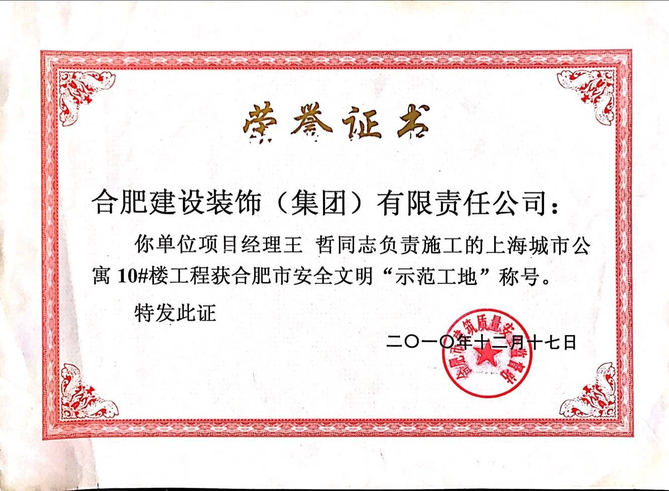 >2010年合肥市安全文明示范工地--上海市城市公寓10#楼工程